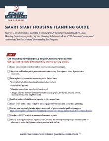 The guide that follows, Smart Start Housing Planning Guide, was adapted from the PLAN framework from Local Housing Solutions. It contains a simplified checklist of recommended steps with customized input from MPP staff, designed to help mayors and municipal leaders move from vision to action.